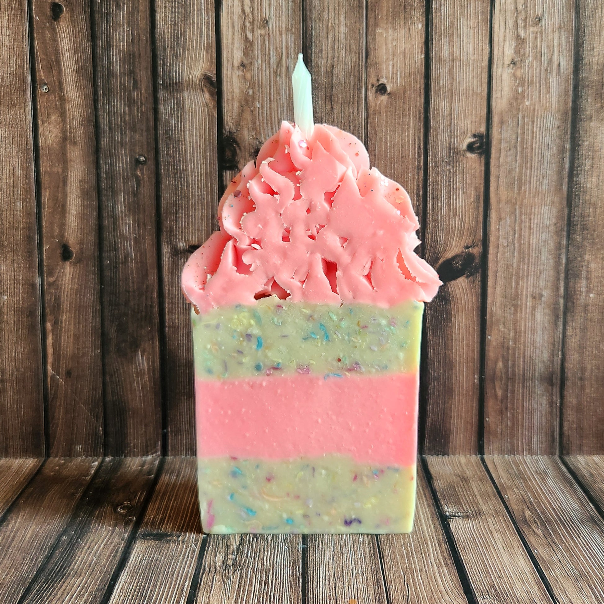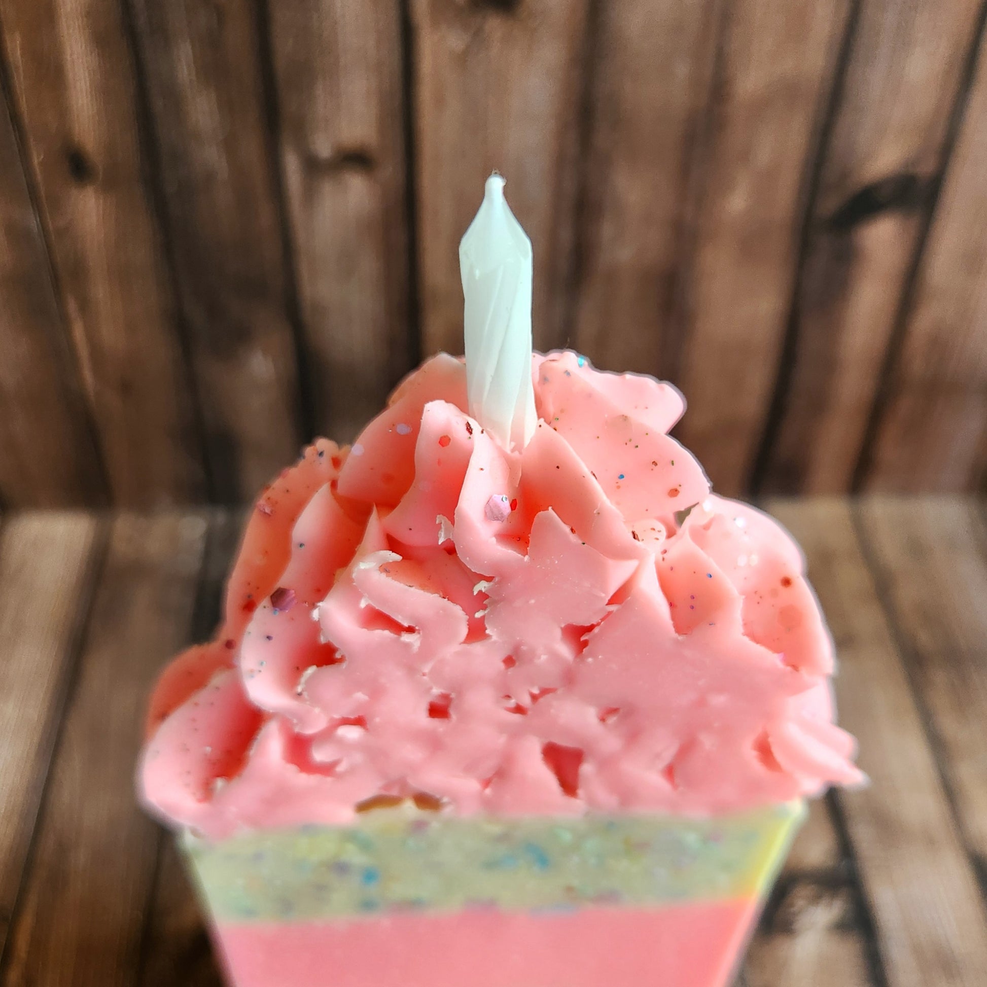 - Design: Cream confetti soap, pink soap frosting with colorful eco-friendly glitter, and a real candle on top.