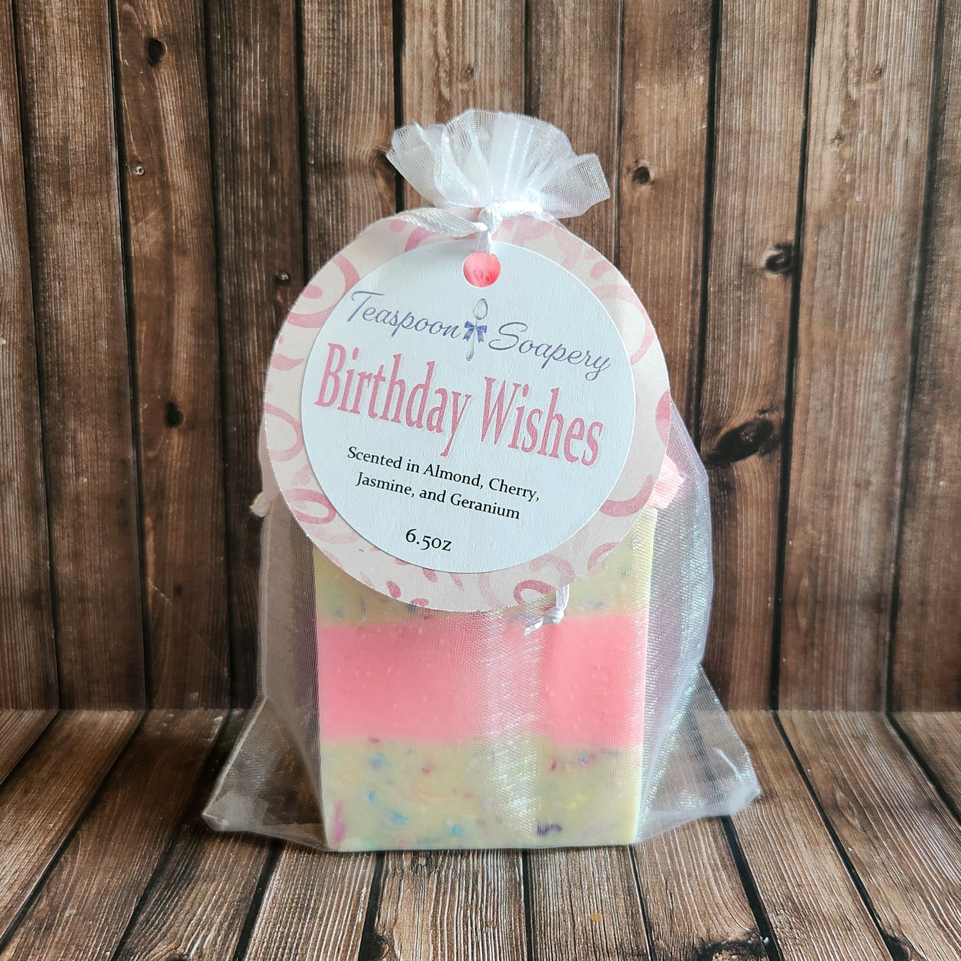 Celebrate every bath with our Birthday Wishes Soap! Beautifully handcrafted to look like a slice of cake and fragranced with a delightful almond scent.